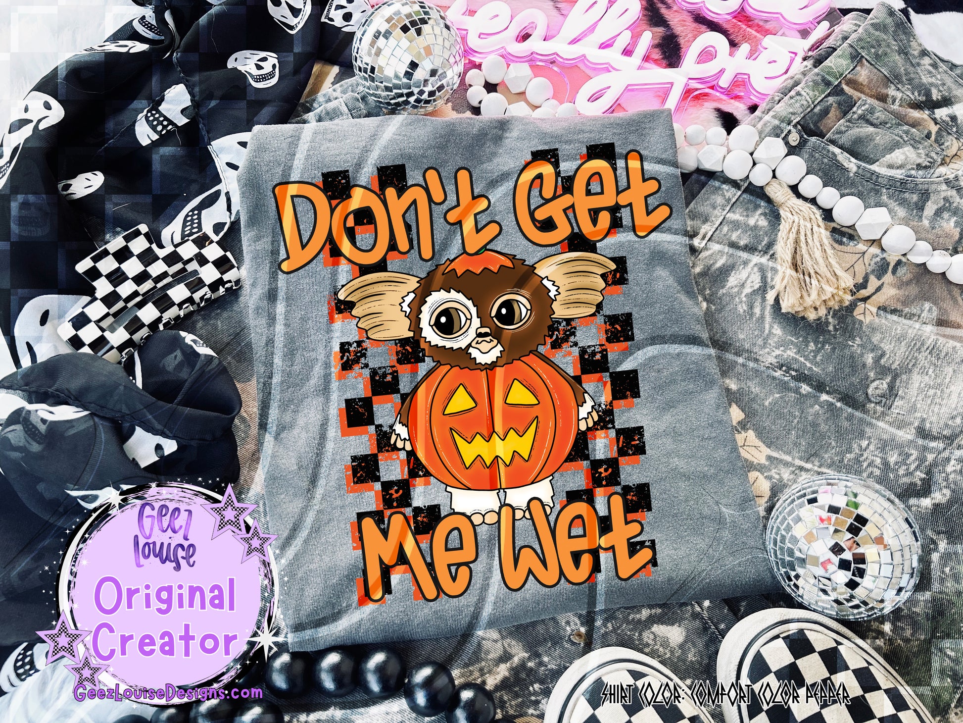 Cute chaos. Spooky rules. Halloween-ready. This Halloween-themed digital design features a wide-eyed creature holding a carved jack-o’-lantern, set against an orange and black checkered backdrop with tiny skulls. With the phrase “Don’t Get Me Wet” front and center, this graphic blends nostalgic horror with playful seasonal flair—perfect for fans of retro monsters and rule-breaking vibes.