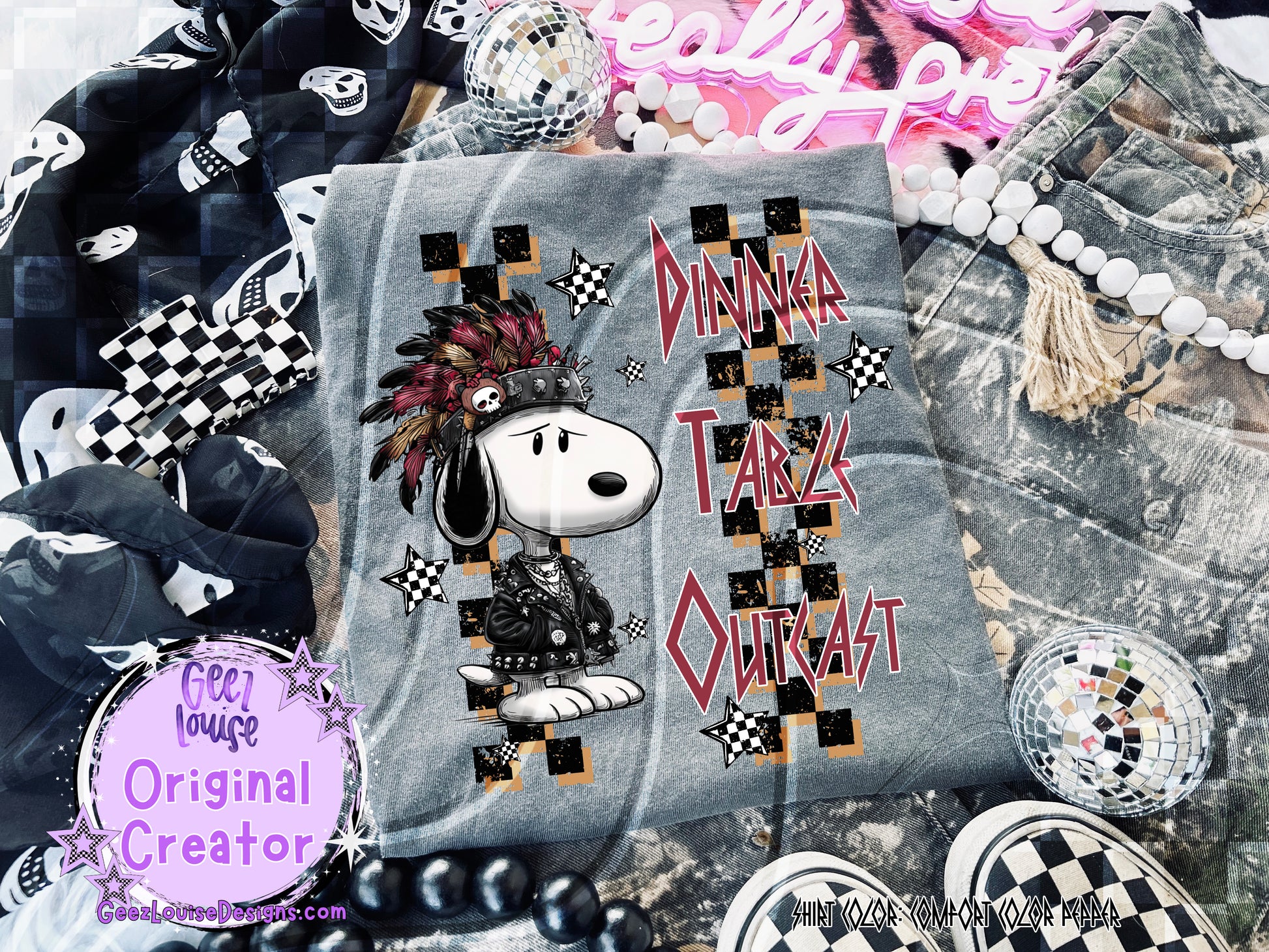 DINNER TABLE OUTCAST is for the ones who show up in eyeliner and existential dread. Featuring a punked-out Snoopy in full gothic glam—complete with feathered headpiece and checkerboard attitude—this design is built for tees, totes, and anyone who’s ever been the weird one at the family gathering.