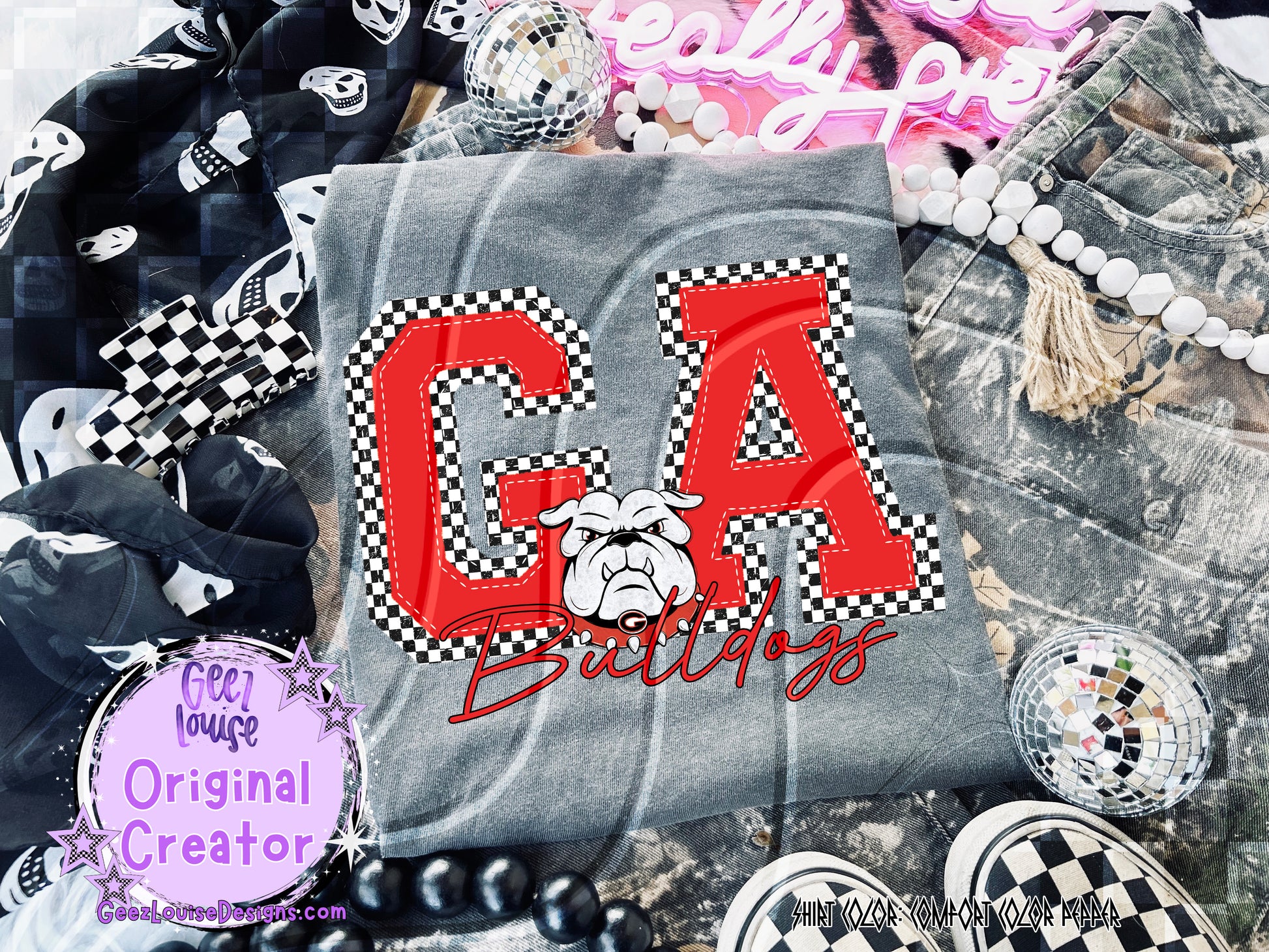 Southern pride with a punk twist. This Georgia-inspired digital design brings the bark and the bite with bold red “GA” lettering, a black-and-white checkered border, and a fierce bulldog mascot front and center. Finished with a cursive “Bulldogs” shoutout, it’s perfect for fans, makers, and merch magicians who want their school spirit loud, proud, and dripping in retro grit.