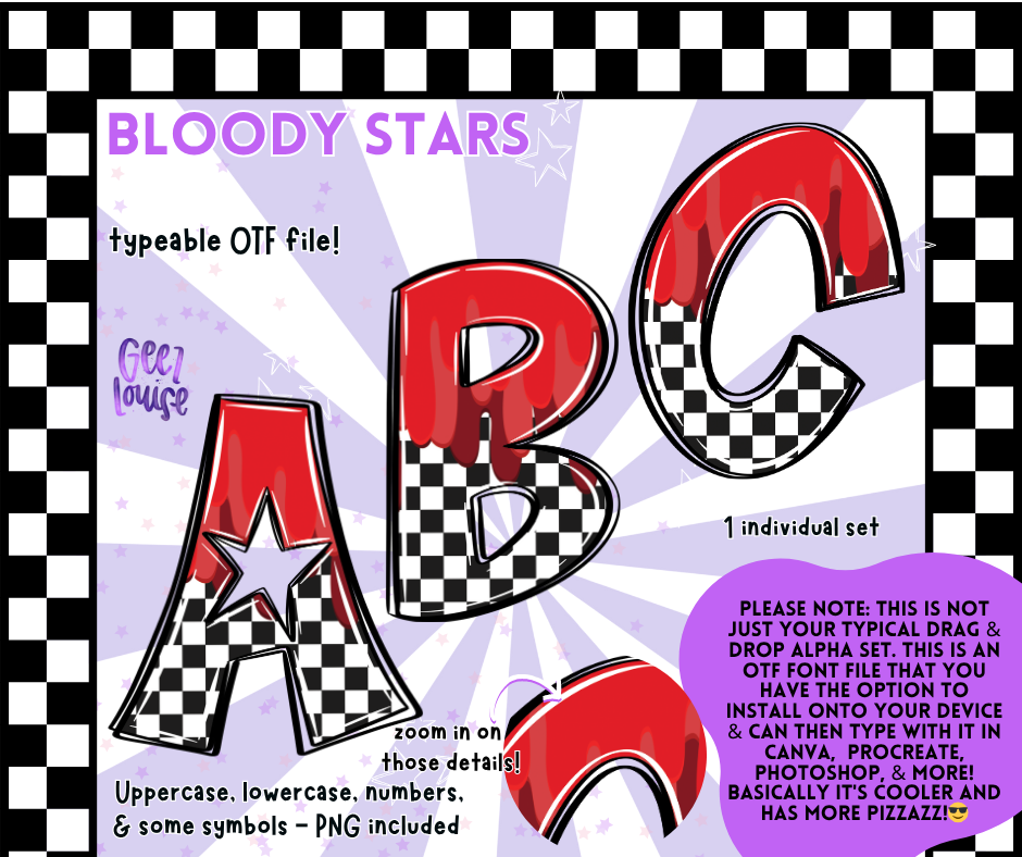 The Bloody Stars Alpha delivers bold checkered letters with dripping “blood” accents and star cutouts for a spooky-meets-galaxy vibe.