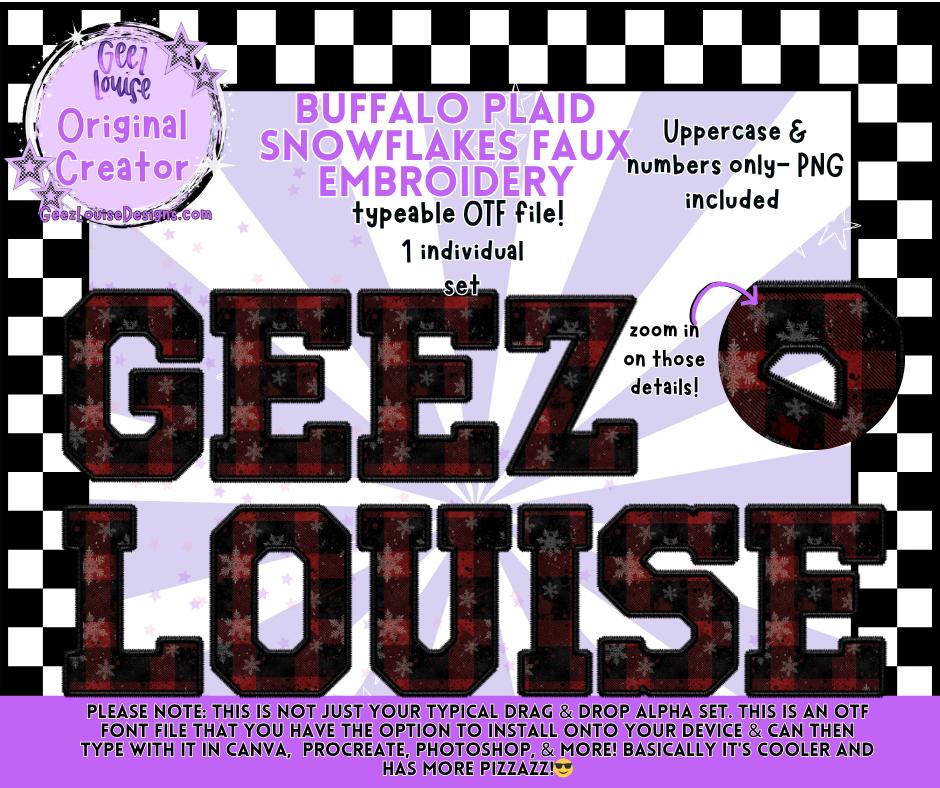 Buffalo Plaid Snowflakes Faux Embroidery Alpha | OTF Font + PNG Set
