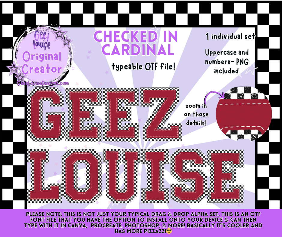 This isn’t your average drag-and-drop alpha set. Geez Louise is a typeable OTF font file stitched with sass and soaked in cardinal red checkers. Designed for creators who want their words to scream louder than their inner monologue, this font brings stitched chaos to Canva, Procreate, Photoshop, and beyond.
