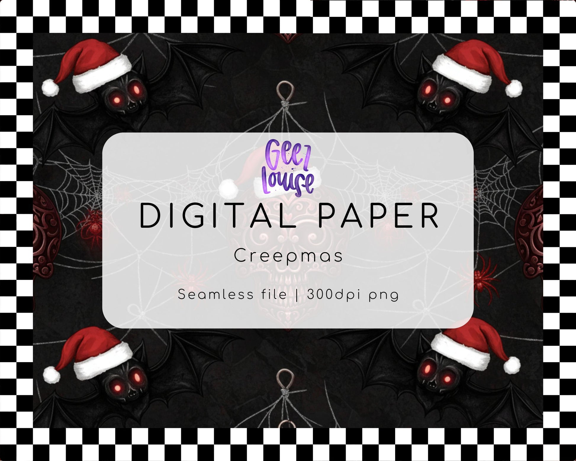 This seamless pattern blends eerie gothic vibes with Christmas cheer — featuring black bats in Santa hats, spiderwebs, and subtle skull details. Perfect for designers who prefer their holidays with a twist of horror and a dash of sass.