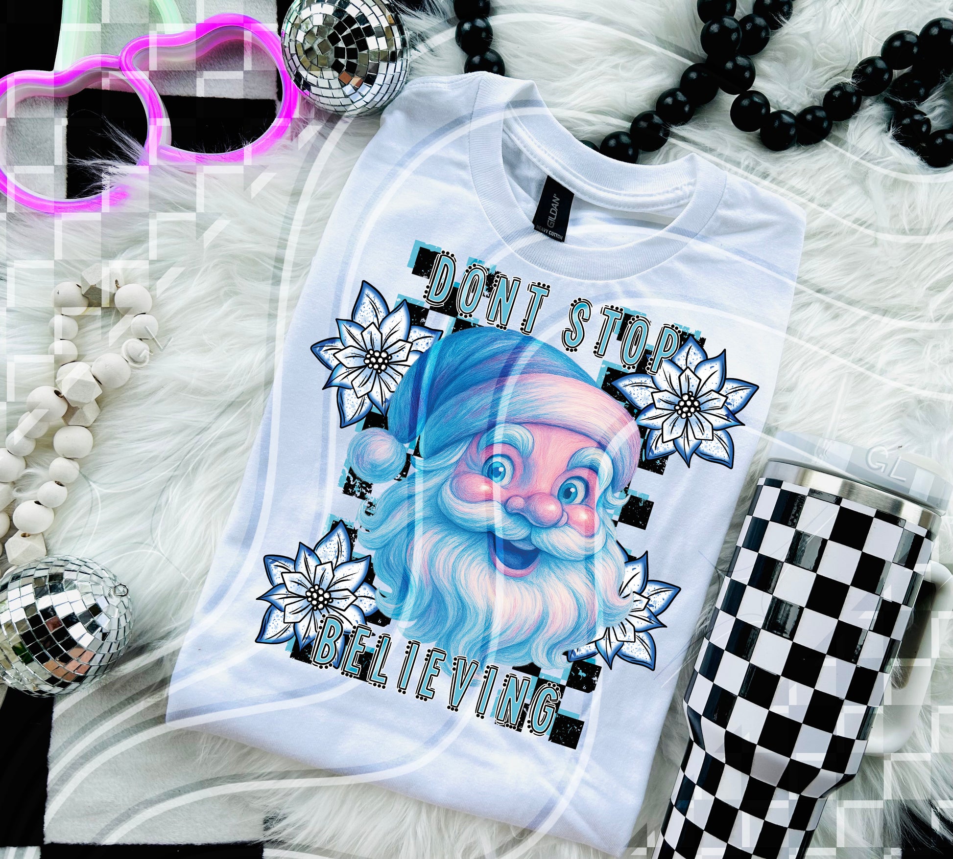 Spread the magic of Christmas with this fun and nostalgic Santa design that reminds us all to never stop believing!