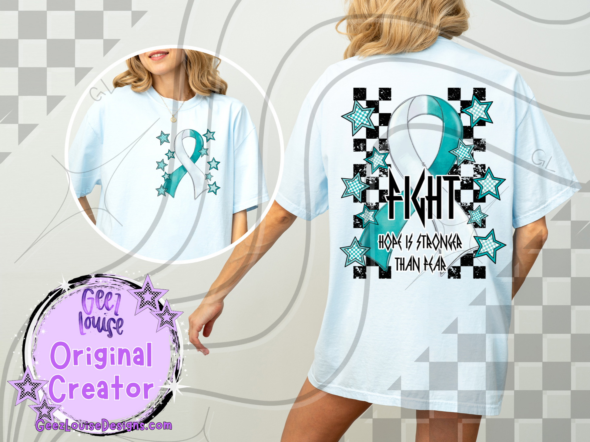 Show strength, courage, and support with our “Fight – Hope is Stronger Than Fear” Digital Design. 💙 Featuring a bold teal ribbon surrounded by stars and a checkerboard backdrop, this design makes a powerful statement for awareness and advocacy.