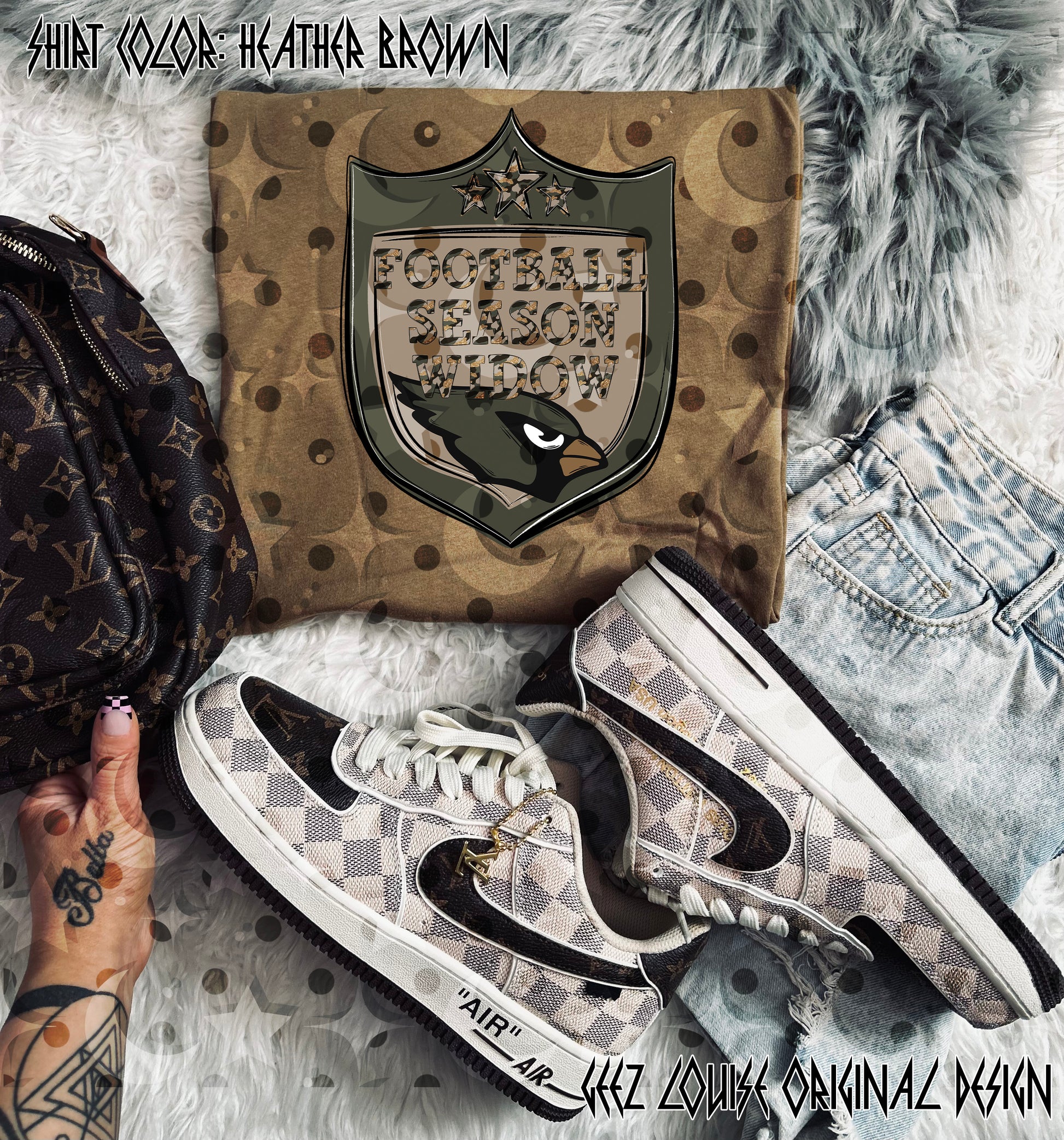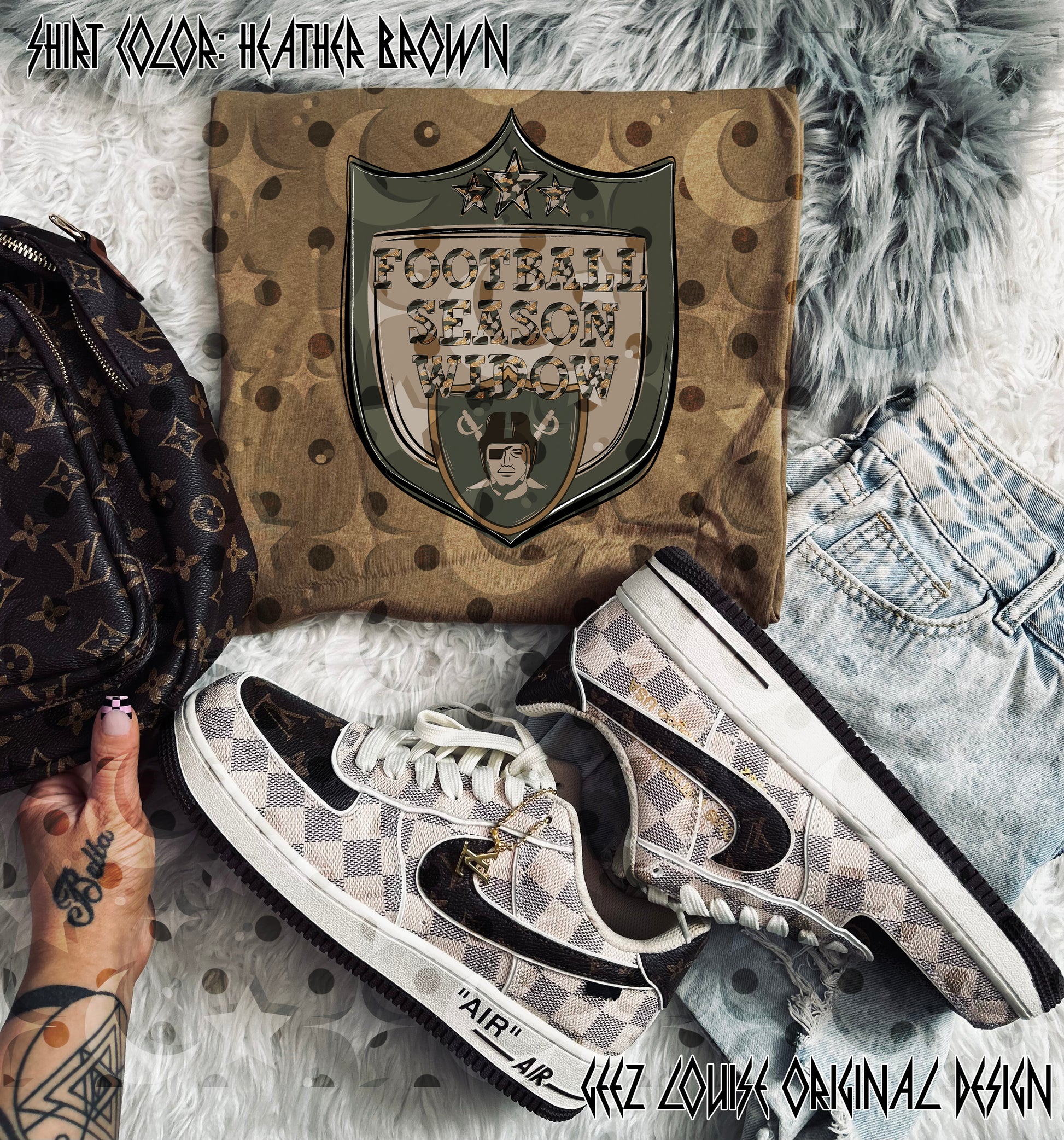 Camo‑grunge shield with bold team icon + Football Season Widow text