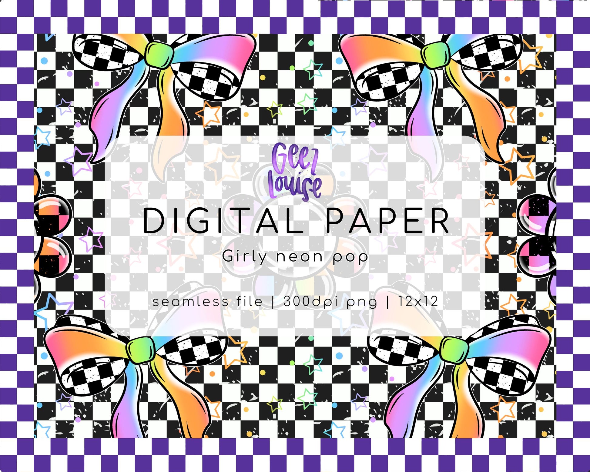 Say hello to bold and bubbly! The Girly Neon Pop digital paper is a wild mashup of retro checkerboard and pastel neon vibes—perfect for anyone who loves their design loud, proud, and ultra-femme. Featuring hand-drawn rainbow bows with black-and-white checker detailing, plus colorful starbursts on a seamless 12x12 background.