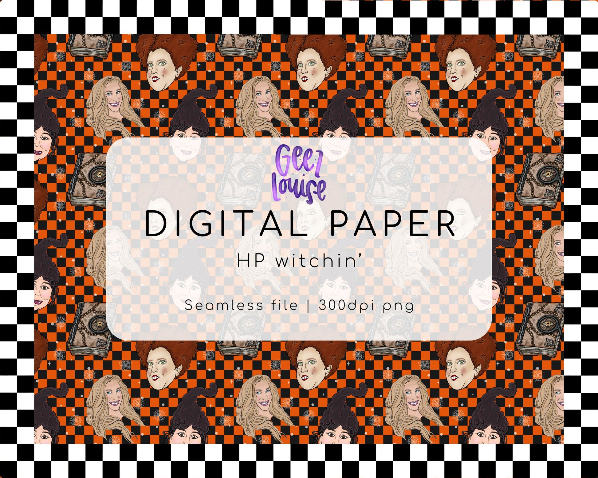 Grab your spellbook and your sass—this HP Witchin’ digital paper is bringing all the nostalgic Halloween vibes. Featuring hand-drawn illustrations of iconic witchy sisters, spooky spellbooks, and a bold orange-and-black checkerboard background, this seamless pattern is perfect for crafting, tumbler wraps, sticker sheets, party printables, and more.