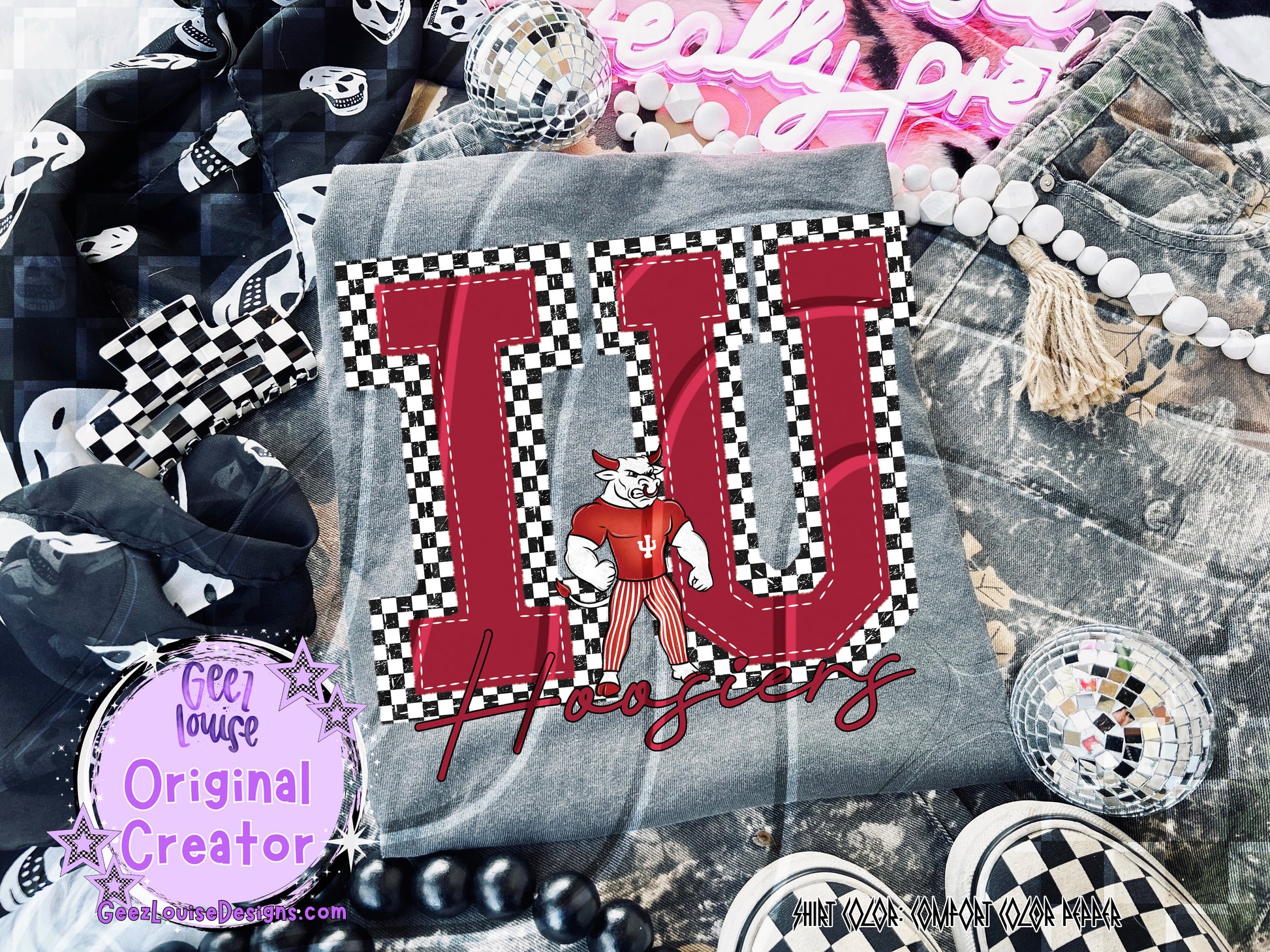 School spirit, but make it loud. This Indiana University-inspired digital design brings the hype with bold red “IU” lettering, a black-and-white checkered border, and a stylized mascot standing proud between the letters. Finished with a cursive “Hoosiers” shoutout, it’s perfect for fans, makers, and merch magicians who want their team pride to glow.