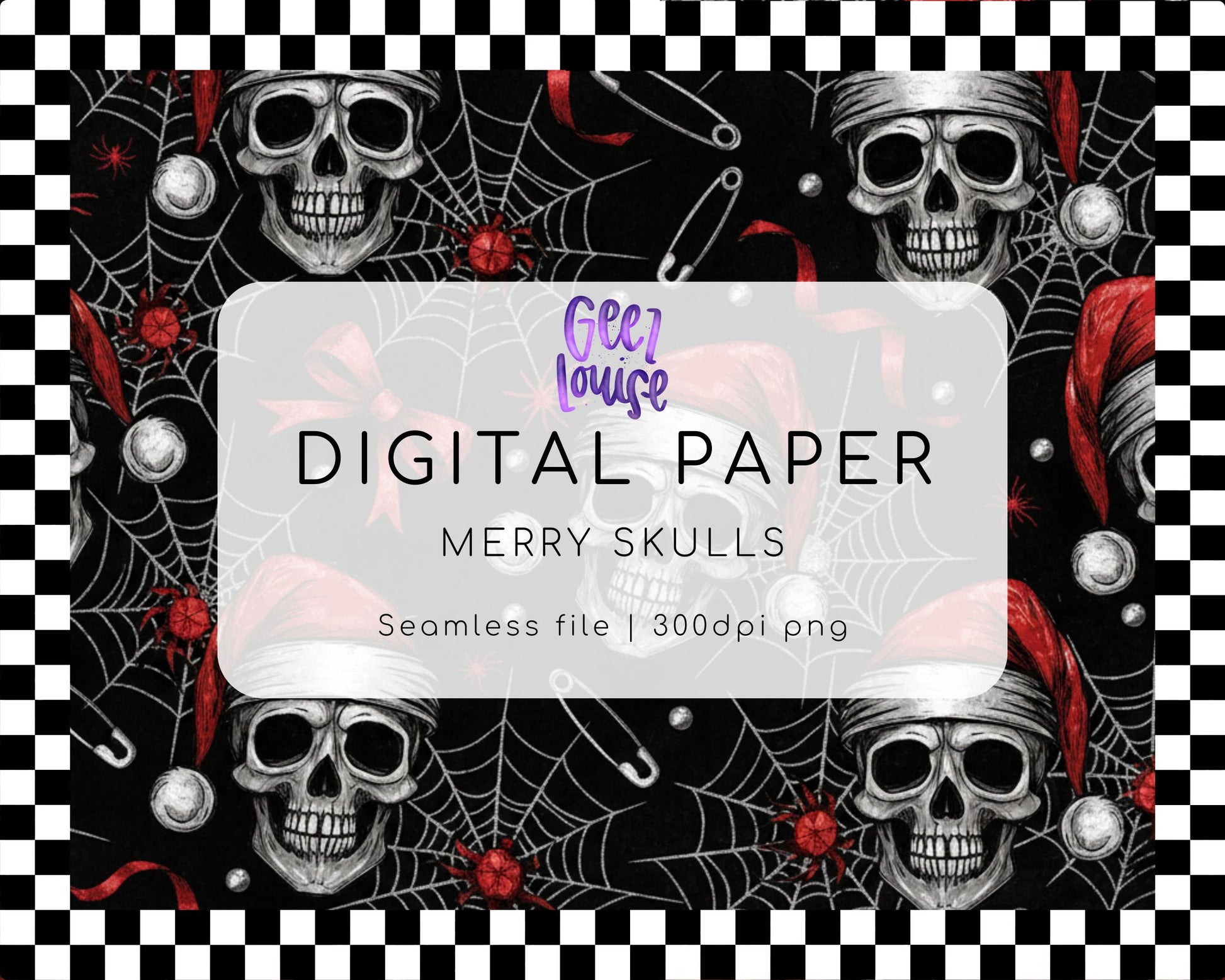 Featuring skulls in Santa hats, spiderwebs, and metallic accents, it’s perfect for wrapping paper, planner pages, backgrounds, or product mockups that need a little dark holiday twist.