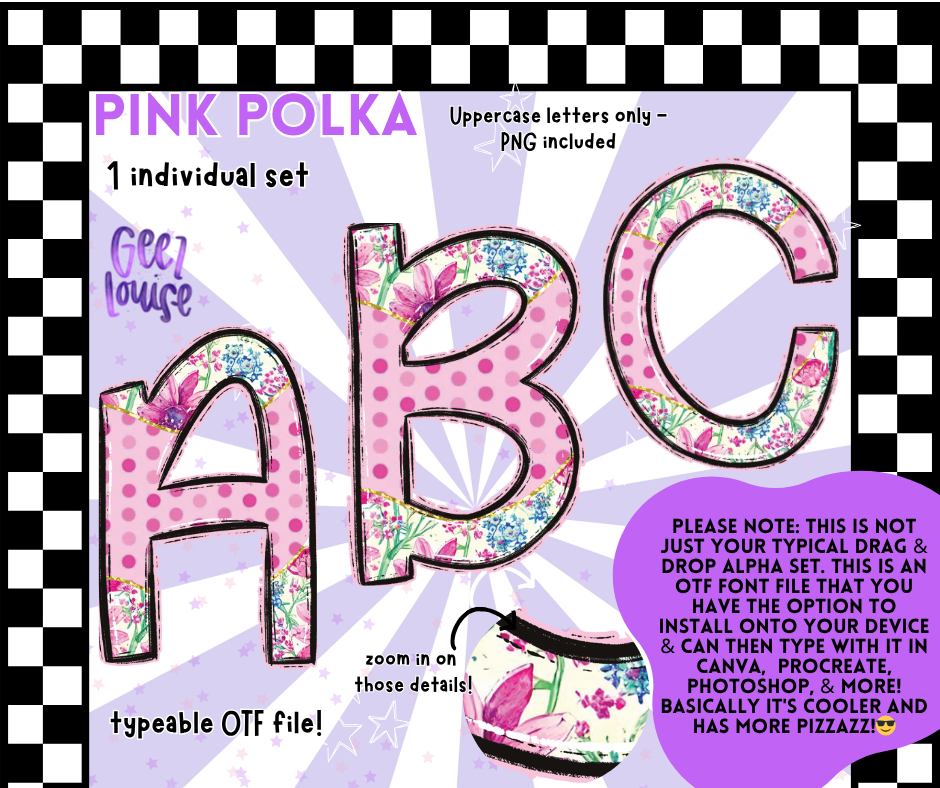Cute, chaotic, and totally typeable. Pink Polka is a full uppercase font dotted with florals, checkerboard accents, and bubblegum-punk energy. It's not just a pretty alpha set—it’s a legit OTF file you can actually install and type with.