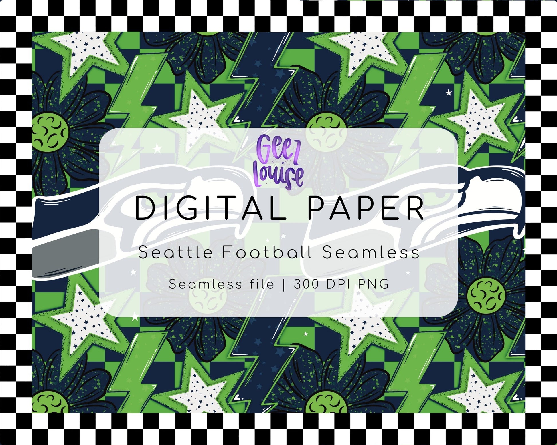 The Seattle Football Digital Paper features a high-impact mix of green and deep blue elements, including lightning bolts, stars, florals, and textured accents—all combined into a seamless repeating pattern.