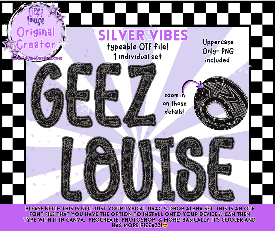 This isn’t just your average alpha set — Silver Vibes is typeable, meaning you can drop it right into Canva, Procreate, Photoshop, and more. Add your text, layer your effects, and let the silver do the talking.