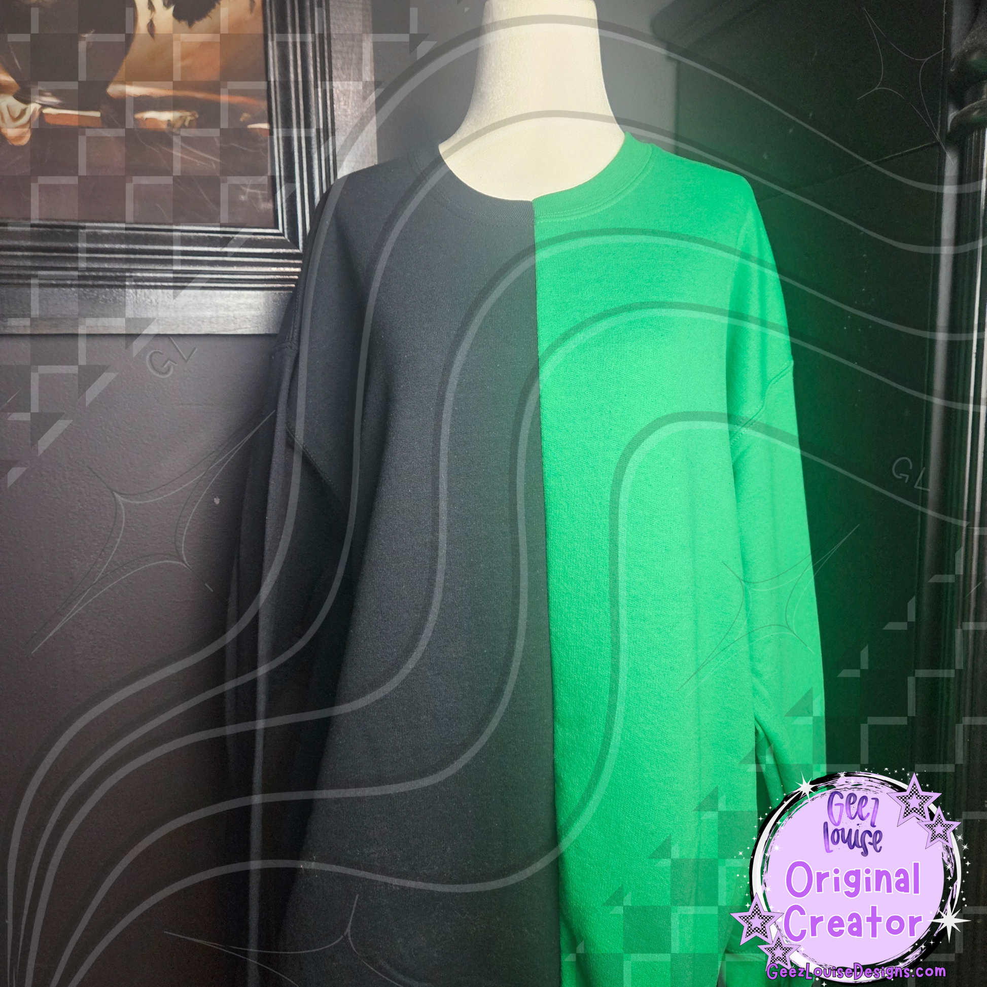 These Gildan 2-tone crewnecks are soft, stylish, and split right down the middle for that perfectly mismatched vibe. Each one is handmade by cutting two sweatshirts and stitching them back together, so every piece is truly one-of-a-kind. Color placement (left/right) is sent completely at random — because chaos is part of the charm.