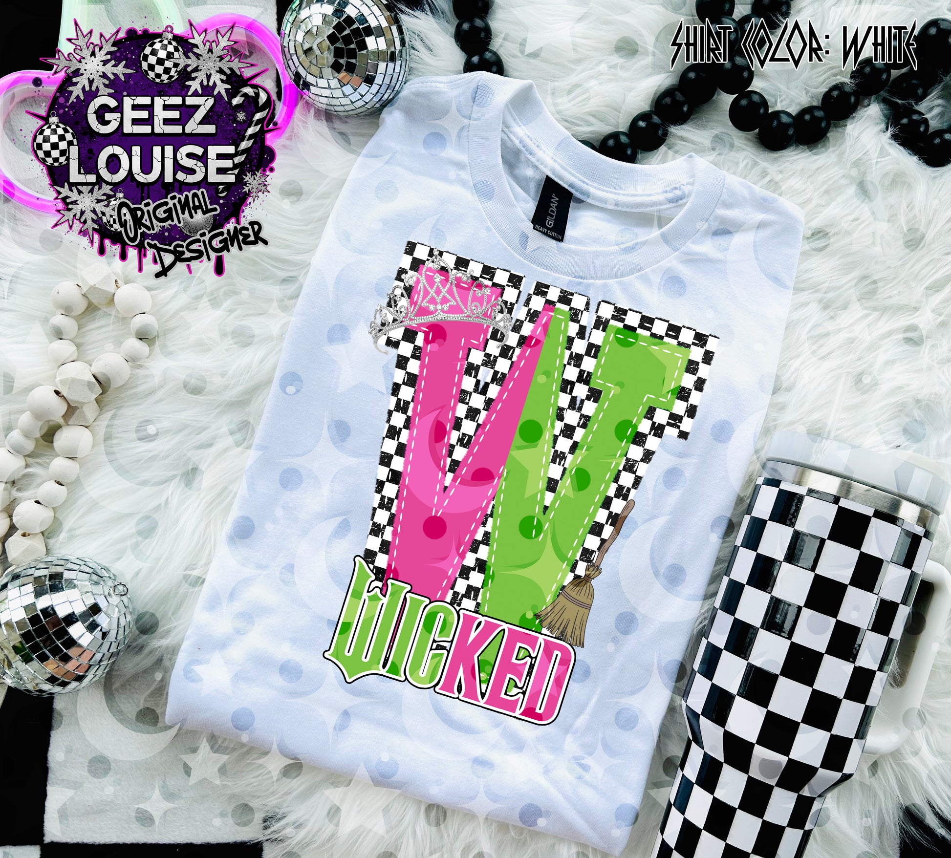 The pink and green checkered “W” pops with retro Halloween vibes, complete with a rhinestone crown and witchy broom accent.