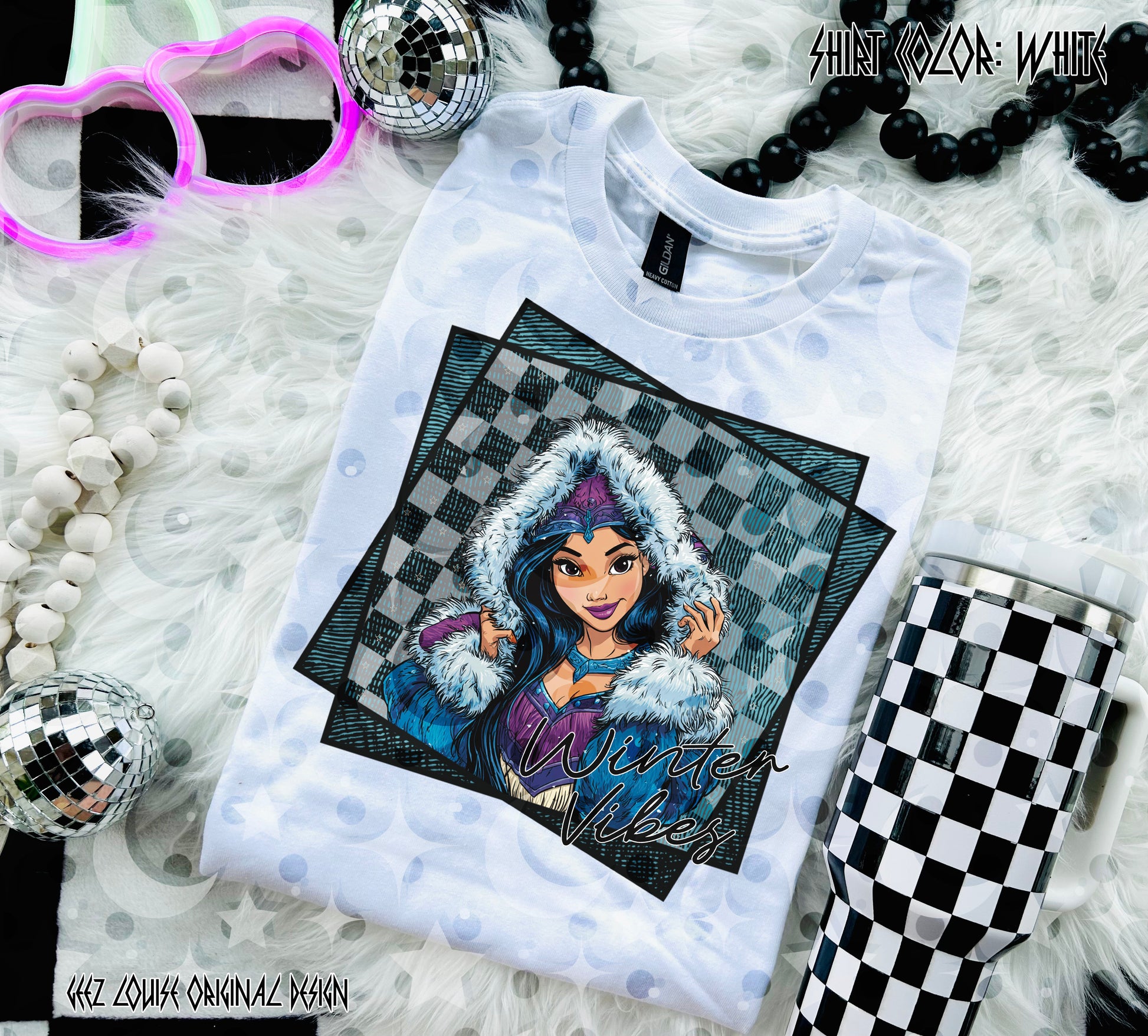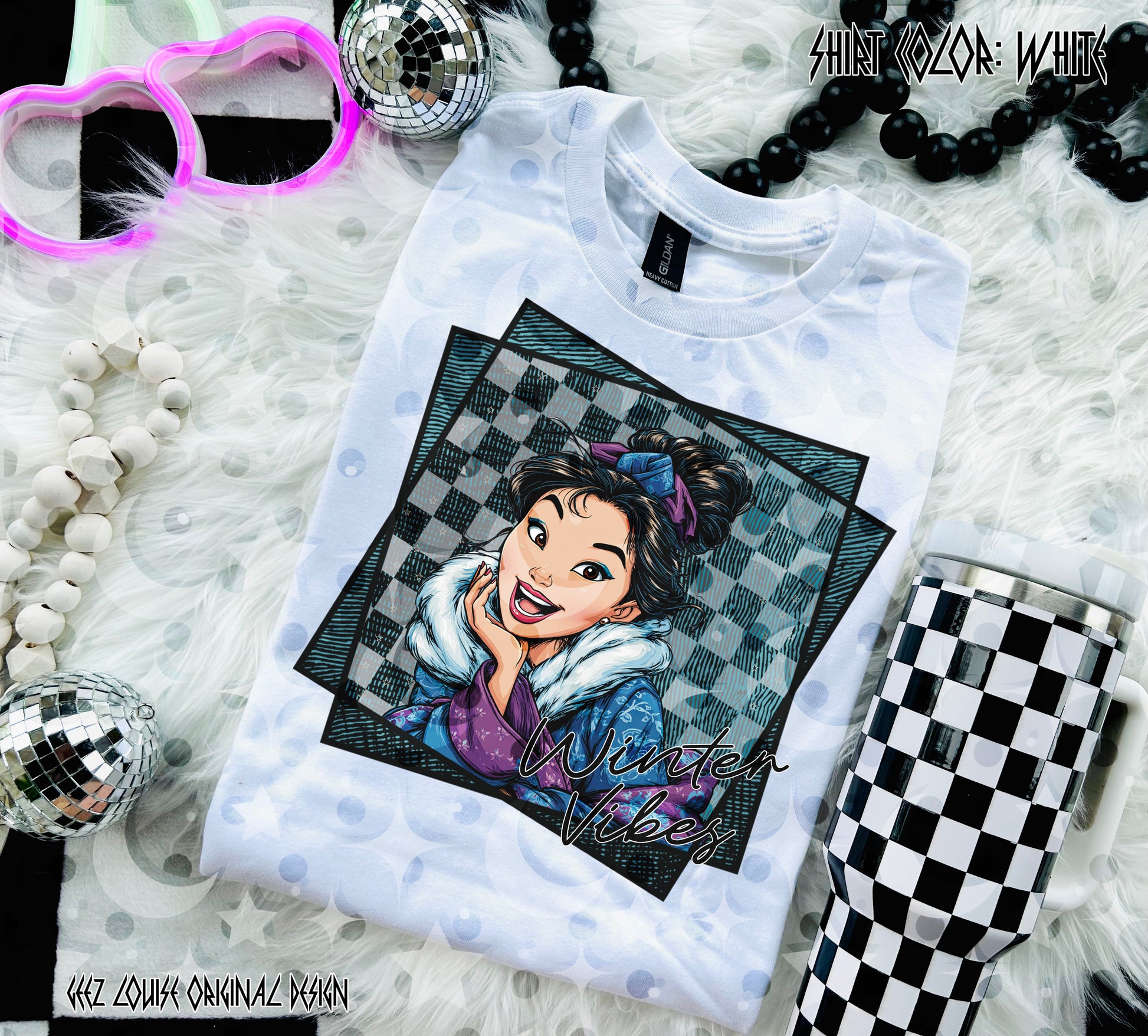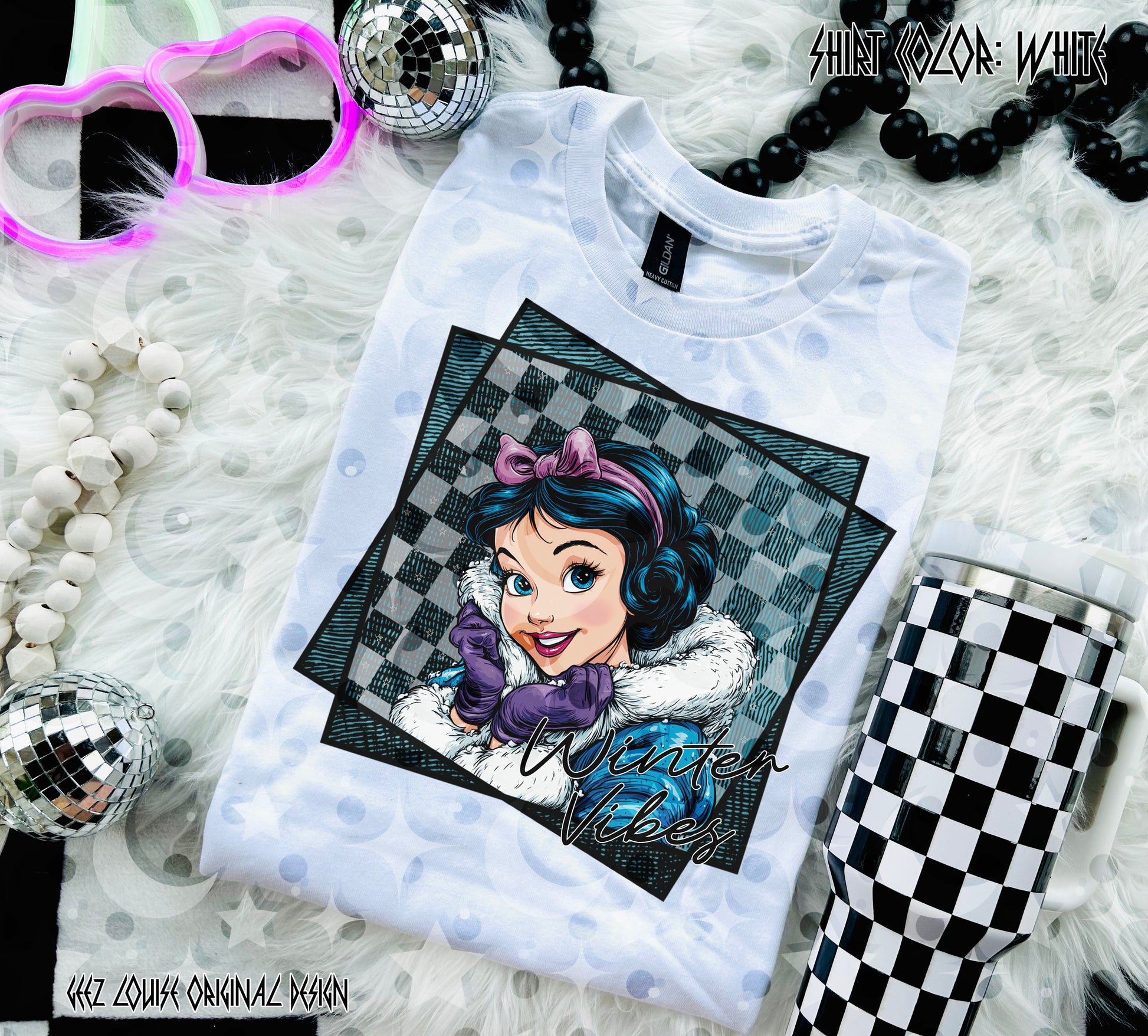 Bring the magic of winter to your shop with this cozy Winter Vibes Princess Collection. Each design features a beautifully illustrated winter outfit, layered over a grunge-checkered background and paired with the phrase “Winter Vibes.”