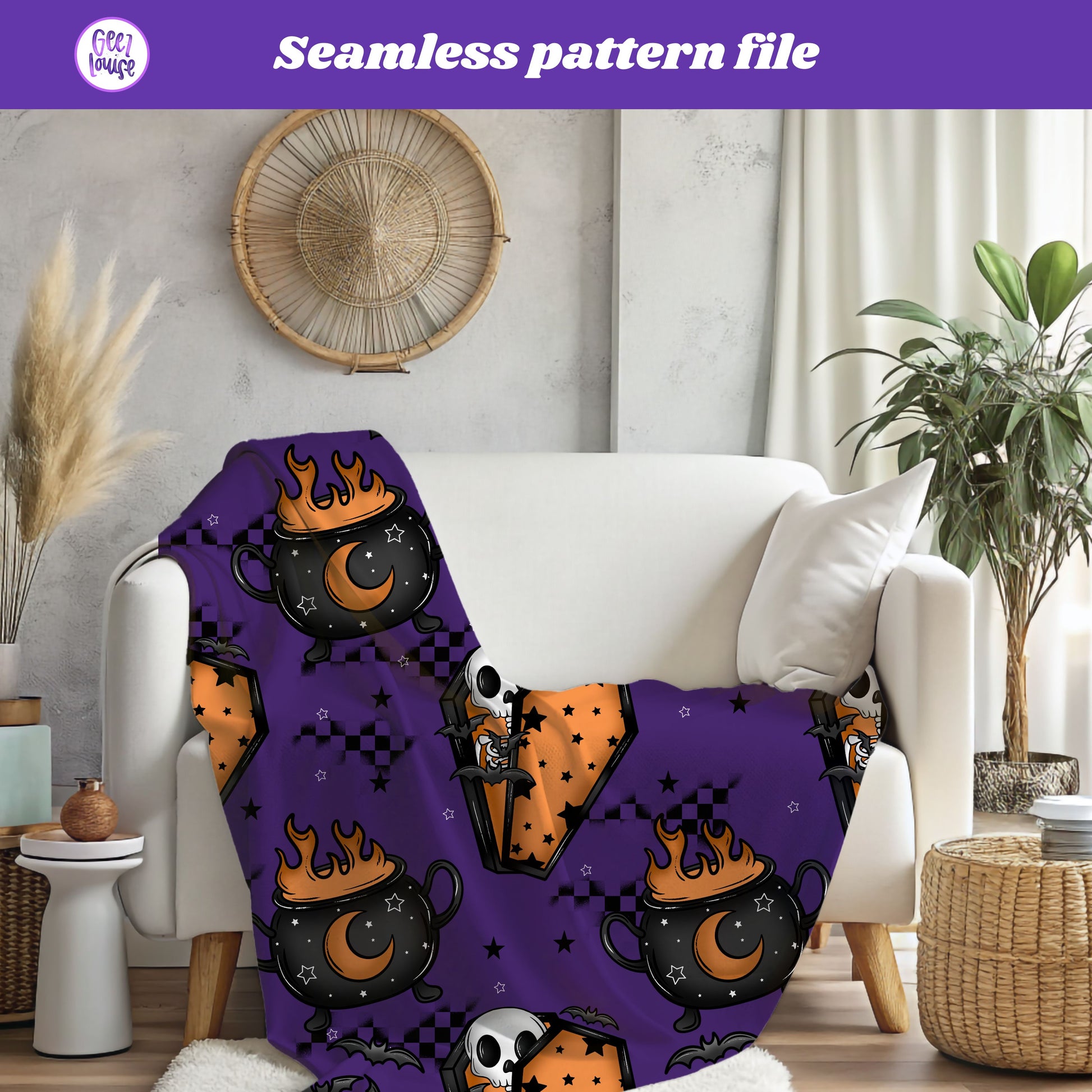 Witchy Cauldron & Coffin Halloween Seamless Pattern | Purple & Orange Digital Paper